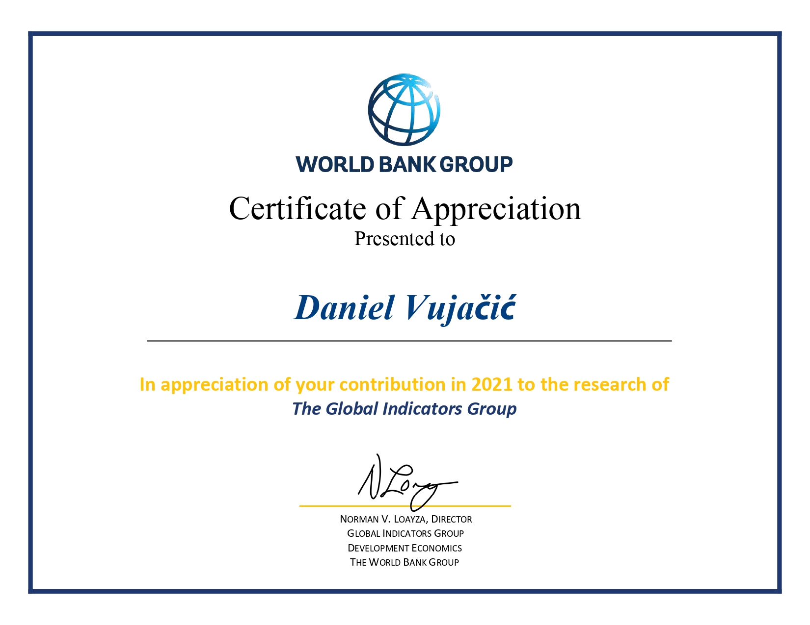 Over the course of his career, Mr. Vujacic has displayed a professional approach, focused on prioritizing the clients’ demands, and ensuring they are met with professionalism and precision. This was recognized by the World Bank Group, earning him a Certificate of Appreciation for his research with the Global Indicators Group in 2021.